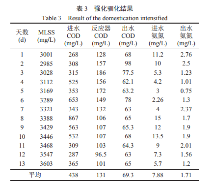 从 4 月 18 日~4 月 30 日,取 CASS 排放水进行实验,污泥取自 CASS 池,,强化训化结果见表 3。由表 3 可知,平均进水 COD 为 438mg/L,MBR 出水