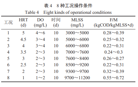 第二阶段从 5 月 1 日到 6 月 22 日,取厌氧反应器 UASB 出水,在 4 月 30 日完成反应器内原有废水替换,然后逐渐缩短 HRT,考察 8 种工况下 MBR工艺对 COD、氨氮、TP 的去除情况。各工况条件及运行情况见表 4。