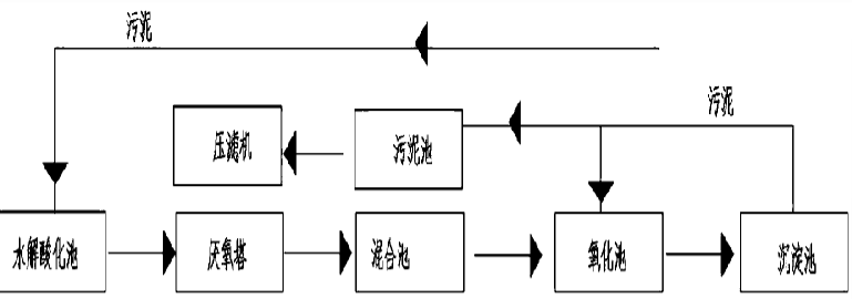 如上所述的沉淀池污泥处理方法,所述厌氧塔排出的废水经过混合池后进入氧化池。厌氧塔出水进入混合池为整体工艺流程的组成部分,其目的是为了进一步的降低水体的CODcr值,减轻氧化池内好氧反应的负荷,使污水处理的最终效果更好。