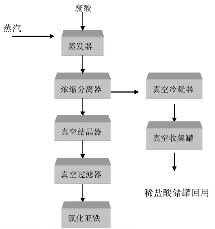根据氯化氢易于挥发和易溶于水的特性及氯化亚铁在盐酸溶液中溶解度的规律,采用蒸汽间接加热、负压蒸发浓缩工艺,蒸发产生的气体经冷凝器冷凝成为稀盐酸,返回酸洗车间再次使用;废酸液经蒸发浓缩使氯化亚铁达到一定浓度后,冷却浓缩液使氯化亚铁以结晶的形式析出,再经分离获取氯化亚铁的晶体。