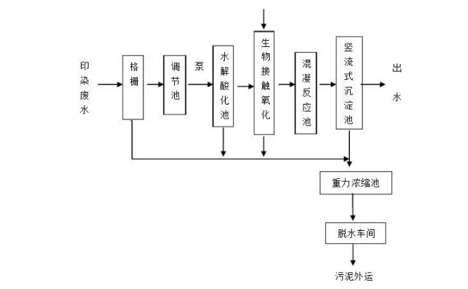 印染废水首先通过格栅拦截水中大的悬浮物或漂浮物,以减少后续处理结构的负荷;然后废水进入调节罐,调节水质和水量;废水的水量和水质可能随时发生变化。这对水处理结构的正常运行非常不利,处理效果越不稳定,甚至对废水处理过程造成严重损害。为了减少废水高峰流量或浓度变化对废水处理过程的影响,应在废水处理系统之前安装一个调节罐。然后废水进入水解酸化槽,在水解和酸化阶段,不溶性有机物被大量水解细菌和酸化细菌通过氧化降解水解成溶解的有机物,可生物降解的大分子物质是转化为可生物降解的小物质。分子物质,从而提高废水的生物降解性,保证后续的生化处理效果,并减少最终排出的剩余污泥量。然后,由水解酸化槽处理的流出物进入接触氧化区以接触氧化槽,并且一些微生物以生物膜的形式固定并生长在填料表面上,并且一些悬浮的水在水中生长至待处理后,水以一定的流速被环状气体氧化。通过填充阶段和生物连接,生物和浮动污泥可以一起工作,以达到净化水的作用。最后,废水需要通过水进行深层混凝和沉淀处理,即在水中加入凝结剂,与废水中的难降解有机物混合,最后去除各种悬浮物,降低浊度和色度。
