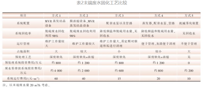 这5种废水处置方式均可实现火电厂末端废水严格意义的废水零排放,各种工艺的比较如表2所示。