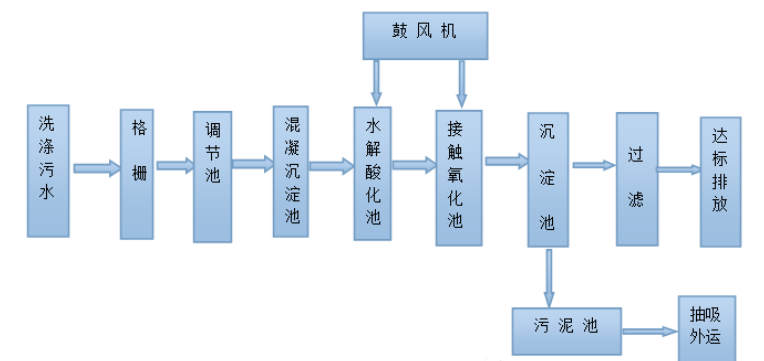 洗涤剂废水的主要特点表现在废水中的主要污染物是阴离子表面活性剂LAS,废水中高浓度的LAS对微生物细胞的活性和增殖具有一定的阻碍作用。因此,使此类废水的生物降解难度加大。废水呈碱性,pH值通常在9—12.另外,废水中缺少微生物合成细胞质必不可少的氮元素。根据次类废水的特点确定采用由物化和生化处理相结合的工艺流程。物化处理采用混凝沉淀,生化处理采用水解酸化和接触氧化。