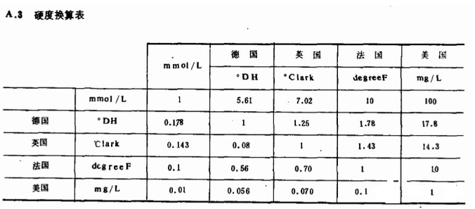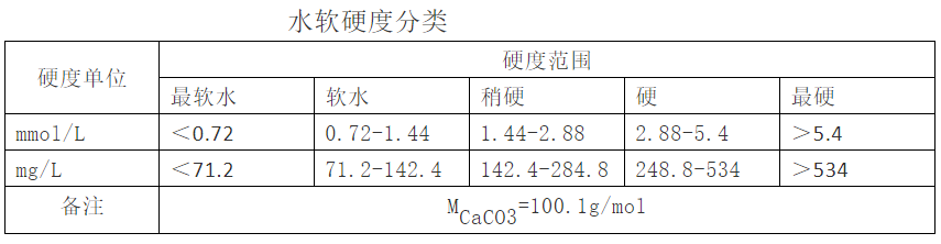 关于硬度,不同的国家有不同的定义概念,如总硬度,碳酸盐硬度和非碳酸盐硬度。总硬度是指钙和镁的总浓度。碳酸盐硬度是总硬度的一部分,相当于跟水中碳酸钙及重碳酸盐结合的钙和镁所形成的硬度。非碳酸盐硬度,是总硬度的另一部分,当水中钙和镁含量超出它们结合的碳酸盐和重碳酸盐含量时,多余的钙和镁就跟谁中的氯化物、硫酸盐、硝酸盐结合成非碳酸盐硬度。还可分为暂时硬度和永久硬度等。