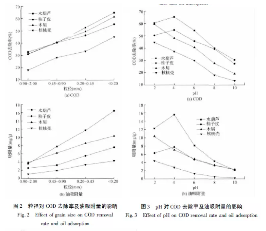 由图2可知,生物质粒径越小,处理效果越好,粒径<0.2mm时处理效果最优;这与相关研究吻合,颗粒粒径减小,总表面积增大,增加了生物质在外表面的吸附几率,而粒径越大,传质扩散阻力越大,影响处理效果。粒径越小,材料整体毛细孔越丰富,根据毛细管凝聚理论,微孔有利于油脂之间相互作用,所以当粒径较小时不仅有表面吸附作用,可能还会产生微孔填充效应,从而增加处理材料对有机物和油脂的吸附量。而同一粒径下,处理效果由大到小分别水葫芦、木屑、柚子皮、核桃壳;水葫芦对COD的去除率达到65%左右、油脂吸附量为16.42mg/g。