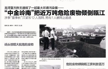 2014年7月15日,龙湾警方联合环保部门,在龙湾蓝田码头当场查获一辆载有固体危险废物塑料袋的大货车,并在码头附近的船上查获大量被塑料袋包装的固体危险废物。随后,执法人员查封中金岭南环保公司的仓库和车间,并陆续抓获相关犯罪嫌疑人。