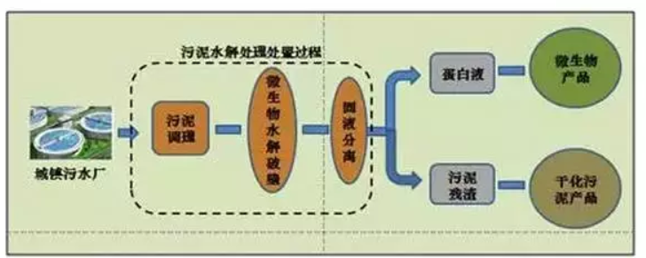 污泥微生物通过水解破壁处理后,其胞内蛋白质和水分得以释放,再经过固液分离后,可到含水率35-45%(减量70%以上)、有机物消减40-50%的污泥残渣和可资源化利用的含蛋白液体。目前天津裕川环境在该方面已取得一定成绩。