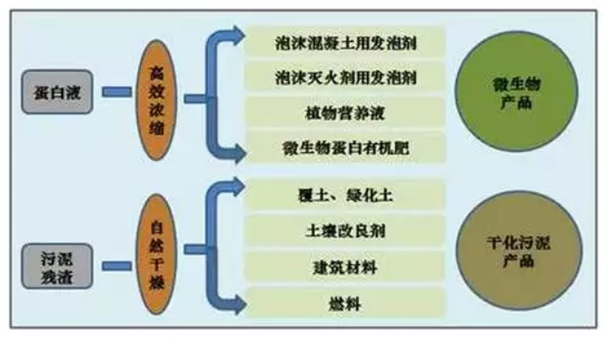 污泥经水解处理后,其含蛋白液体经浓缩后可作为蛋白发泡剂和有机肥等利用,污泥残渣可用做覆土、绿化土、土壤改良剂和建筑材料等。