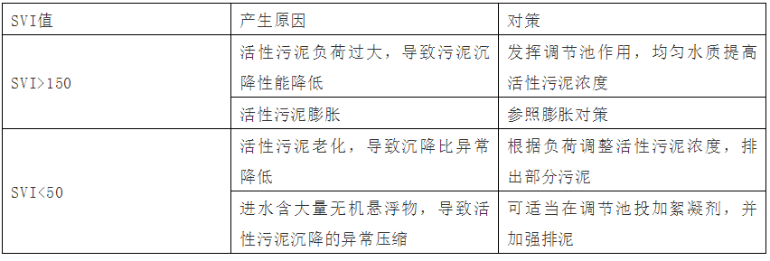 污泥体积指数SVI=SV30/MLSS,SVI在50~150为正常值,对于工业废水可以高至200。活性污泥体积指数超过200,可以判定活性污泥结构松散,沉淀性能转差,有污泥膨胀的迹象。当SVI低于50时,可以判定污泥老化需要缩短污泥龄。