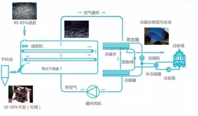 污泥低温干化设备利用低温热泵封闭除湿原理,通过对流热风干燥的方式对污泥进行脱水干化减量,整套系统采用全封闭式设计,干燥热风无损耗。