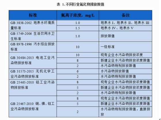 地表水、生活饮用水、污水及含氟工业废水的排放标准如表1所示。
