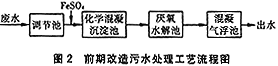 由于该项改造工程具有很强的实用性,实际上是边生产、边研究、边制定方案的改造过程,在确定物化处理流程时,先做了大量的化学混凝脱色试验。采用传统方法,对硫酸亚铁、净水剂、聚合铝和三氯化铁主要以去除色度、COD为目标,通过小试先确定适合本厂的脱 色效果和去除COD的最佳药剂为硫酸亚铁,其最佳投药量在800~1000mg/L,最佳pH值范围在9.5~11之间。