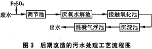 ③ 对这种高浓度呈强碱性的印染废水,在生化前要进行中和。硫酸亚铁对这类印染废水有独特作用,预处理采用投硫酸亚铁的办法,能去除部分色度,并且能使COD降到900mg/L以下。