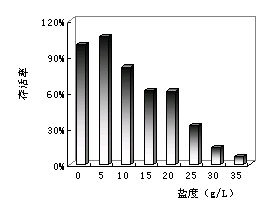 ![]() 2.2 淡水微生物在不同盐度下的存活率 不同生活在淡水环境下或者淡水处理构筑物中的微生物接种到高盐环境下,仅有部分微生物存活。这是盐度对微生物的一种选择。将淡水微生物的存活率定义为100%,当盐度超过20g/L,其存活率低于40%。因此,当盐度超过20g/:L,一般认为用不同淡水微生物无法进行处理。