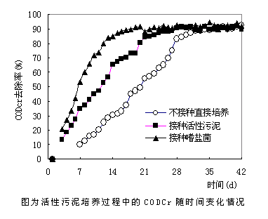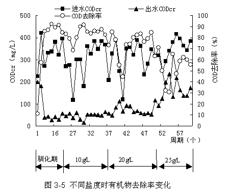 ![]() 3 适盐微生物的分类与利用 耐盐微生物:能耐受一定浓度的盐溶液,但在无盐条件下生长最好,其生长也不需要大量无机盐。 ![]() ![]() 此图为部分适盐微生物形态的电镜图 4 生物处理高盐污水遇到的问题 盐度适应差 传统活性污泥法驯化处理盐度低于2%含盐废水。 当盐度环境变为淡水环境时,污泥的适应性会很快消失。 盐度变化影响大 盐度在0.5~2%变化通常会对处理系统产生严重的干扰。 突然变化盐度比逐渐变化盐度对系统的干扰更大 从高盐变为无盐产生影响比低盐环境变为高盐环境产生的影响要大 降解速率缓慢 随着盐度的升高有机物降解速率下降,因此低F/M更适合含盐废水的处理。图3.5为SBR法处理在各盐度下的处理效果。 污泥流失严重 盐度改变污泥中微生物的组成,改变了污泥的沉淀性和出水SS,污泥流失严重.