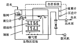 一体式中空纤维膜—生物反应器的中试装置设在清华大学东北浴室附近,用于处理学生浴室的洗浴污水,其工艺流程如图1所示。整个装置主要由生物反应池和膜组件两部分组成。生物反应池尺寸为0.9 m×0.93 m×2 m,有效容积为1.5 m3,内部被隔板分为升流区和降 流区两部分。聚乙烯中空纤维微滤膜组件共有8块,膜总面积32m2,分两层置于反应池升 流区。膜组件下设有穿孔管,曝气量控制在35~50 m3/h。压差计用于监测在运行过程 中膜过滤压差的变化。液位控制器用于控制生物反应池液面使之恒定。电子流量计用于测定膜出水的瞬时流量和累计流量。
