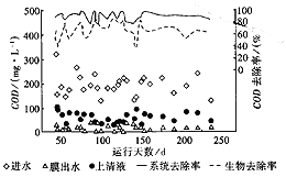 图2为原水、生物反应池上清液和膜过滤出水的COD变化情况以及系统各部分对COD 的去除效果。