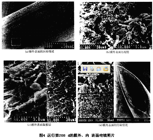 ⑤电镜观察表明,膜外表面污泥层的沉积、凝胶层的增厚和膜内表面微生物的滋生是造成 膜污染的主要原因。