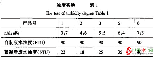 A1/Fe的摩尔比对絮凝性能的影响见表1。从表1可知,PSAFS的絮凝效果在相同剂量范围内,当 和Fe摩尔比为7:3、4:6、5:5、6:4、7:3时,PsA 絮凝性能的影响,当A1/Fe=4:6时,絮凝剂的除浊效果最好,本实验A1/Fe的摩力比选用4:6。原因是这是因为Fe3 加入后,AP 和Fes 在水解过程中会通过羟基桥连成多核多羟基络合物,这种多核多羟基络合物具有更强的电中和能力和架桥吸附能力,PSAFC的分子结构呈长链枝权状聚集态。随着铁离子含量增加,除浊效果加强,样品的分子链长度增加,这一点正好解释了出现以上现象的原因。但是,随着铁含量的继续增加,絮凝效果的增加趋缓。
