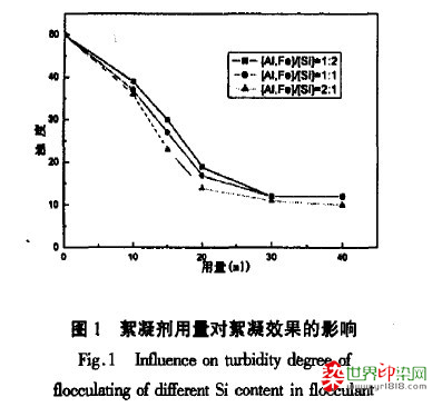 如图1所示,随着硅含量的降低,剩余浊度达到最低,而且试验现象显示,絮凝的矾花大且沉降速度也是最快。这是因为当絮凝剂中硅含量高时,金属离子含量相对不足,活性硅酸的自身聚合反应得不到有效的控制,硅酸聚合速度比较快,这样絮凝剂投入水中后,金属离子水解产生的多核羟基离子含量很少,电中和作用很差,不能使水中颗粒物脱稳,也就不利于黏结架桥作用的充分发挥,所以综合絮凝效果没有明显的改善。因此,最佳的[A1,Fe]/Si]摩尔比为1:1。