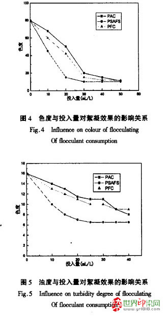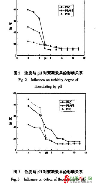 由图2、图3可见,PSAFS适用的PH范围更为广泛,且在pH>5的情况下,PSAFS对印染废水的色度和浊度的去除率最高。