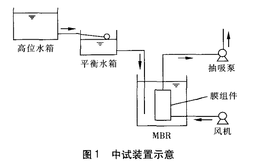 废水由高位水箱经平衡水箱进人MBR,高位水 箱容积为0.64 ITI 。在反应器中污染物经微生物降 解后,由抽吸泵将膜滤水抽出。MBR容积为0.4 ITI ,膜组件采用中空纤维滤膜,膜孔径为0.1~0.4 Ixm,膜通量为0.328 m /(m ·d),运行方式为抽吸 12 rain、反冲3 rain。