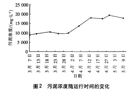 试验开始后的20多天,反应器污泥浓度为 9 000~10 000 mg/L;随着运行时问的延长,约10 d 左右,污泥浓度逐步升至18 000 mg/L;继续运行20 多天,污泥浓度基本维持在18 000~19 000 mg/L; 在之后的运行中,污泥浓度未持续增长,微生物增殖 和自身消化达到动态平衡。(见图2)