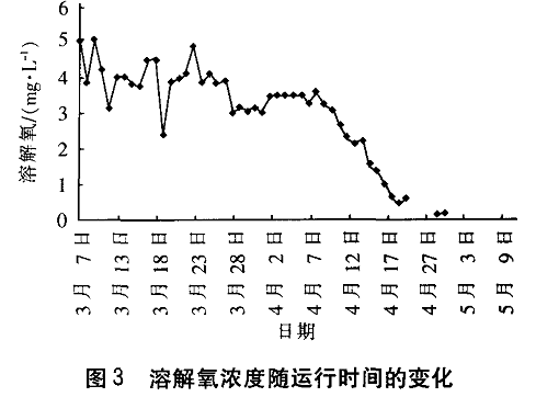 2.2溶解氧浓度随运行时间的变化在试验开始后的2 0 d左右, 溶解氧浓度为4 m g / L左右; 随后 1 0 d左右, 溶解氧浓度降到3~ 3.5m g / L ; 继续运行 2 0多天 , 溶解 氧浓度逐渐降到0.5 m g / L左右; 之后, 溶解氧浓度降到0.2 m g / L左右, 反应器已处于缺氧状态,见图 3 。
