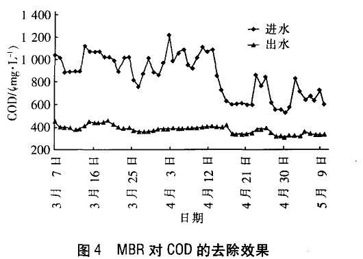 2.4对C O D的去除效果:MB R对 C O D的去除效果见图 4 。