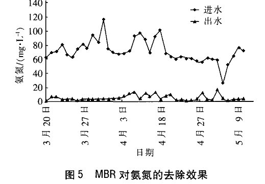 MB R对氨氮的去除效果见图5 。可知, 除个别测点外,进水氨氮浓度基本上在 5 0~1 1 0 m g /L之间波动, 出水氨氮浓度大致为 2~1 5 mg /L , 经计算,整个监测过程中出水氨氮均值为4.9 7 mg/ L , 去除率均值为9 3 %。试验后期,溶解氧浓度降至0 .5 m g /L 以下, 水力停留时间逐渐减至8 h ,对氨氮的去除率仍在9 5 %以上,这说明高污泥浓度、低溶解氧状态下的MB R工艺对氨氮的去除效果很好 。