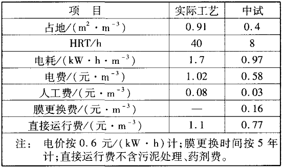 技术经济指标对比见表 1 。可知, MB R工艺的占地面积、H R T、运行费等均小于现场实际工艺, 技 术经济指标优于现场实际工艺。