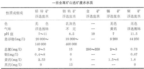 (7)化学耗氧物:化学需氧量是水中的耗氧有机物的量化替代性指标,在选矿废水中的耗氧物,主要是残存于水中的选矿药剂。一些金属矿山选矿废水水质如表。