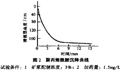 以浓度为300~mg/L的选矿污水为试液(pH=8.12),在室温下在100mL量筒和直径40ram,高2m的沉淀管内对聚铁、聚铝、聚丙烯酰胺等进行筛选试验。从絮凝物的沉降速度和上清液的浊度两个方面评价各种絮凝剂之间促进沉降效果的次序,肯定了阴离子型聚丙烯酰胺对处理该选矿废水的沉降效果最好。试验曲线见图2。