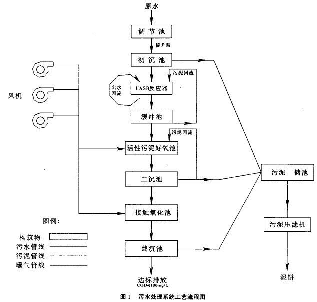 从上表不难看出上流式厌氧污泥床(UASB) 是比较优越的处理工艺,在较低的造价和能耗下不仅有较高的有机物容积负荷,而且有很高的处理效率。因此该厂选用上流式厌氧反应器作为工艺主体构筑物。其构造与其它厌氧生物处理装置的不同之处是:1、废水由下向上流过反应器;2、污泥无需特殊的搅拌设备;3、反应器顶部有特殊的气、液、固三相分离器。整个废水处理工艺采用 “UASB反应器+活性污泥曝气池+接触氧化池”的处理工艺。废水处理工艺流程见图1。
