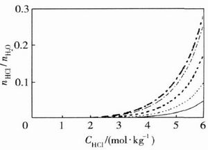 因为盐酸有共沸点,按常规理解似乎不可能回 收浓的盐酸,但考虑到RECl3的盐析效应,首先从 理论上计算了含SmCl3的盐酸体系中水及HCl的 分压,发现相对于纯盐酸溶液而言,同条件下,由于 SmCl3存在,导致溶液体系H2O分压减小,而HCl 分压增大,而且随SmCl3浓度增大,H2O分压的减 小及HCl分压增大趋势更为明显.图4为根据计算 结果作出的气液平衡关系图.