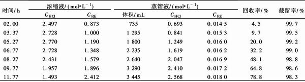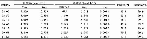 试验中稀土反萃液CRE=0.6~0.9 mol/L, CHCl=2~2.5 mol/L,重稀土反萃液:CRE=0.2~ 0.4 mol/L,CHCl=4.5~5.5 mol/L,每次用料液 5 L,料液温度62~63℃,冷侧压力8~10 kPa,料液 循环速度5.4 cm/s.
