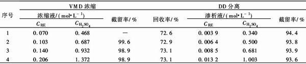 集成膜法回收硫酸稀土溶液中硫酸,系指先采用减压膜蒸馏浓缩低浓度的硫酸稀土溶液,再采用扩散渗析法处理浓缩液以回收其中硫酸,其中扩散渗析的料液为减压膜蒸馏浓缩硫酸稀土溶液的浓缩液.由于扩散渗析处理的是浓缩液,较之单独采用扩散渗析法回收硫酸稀土溶液中的硫酸,处理量大大减小,设备的一次性投资因此降低,而且回收得到的硫酸浓度增大.表为经减压膜蒸馏浓缩不同程度 的硫酸稀土溶液,再经扩散渗析的实验结果.实验固定条件,料液成分:CRE=0.070 mol/L,CH2SO4= 0·468 mol/L,减压膜蒸馏浓缩时,温度60℃,料液流速5.8 cm/s,减压侧压力12.7 kPa;扩散渗析操作方式为一次通过式,料液流量150 mL/h左右,流量比1.0左右,温度28~29℃,渗析料液为减压膜蒸馏浓缩过程所得的浓缩液.
