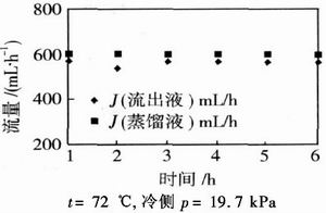 以预浓缩至碱浓度为244 g/L的2 L溶液循环 液置于槽2中.碱浓度为122 g/L的料液连续从11 号高位槽进入2号槽,从2号槽上部溢流口相应连 续流出浓缩液至13号计量槽.8号槽收集冷侧之蒸 馏液.图2为循环槽溢流流出液及蒸馏液流量随时 间的变化关系.