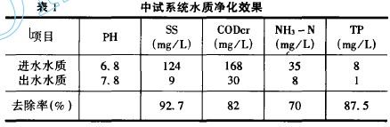 物的吸收以及逐步提供了去除污染物的环境,使得污染物去除率也相应提高。由于污染物经DAF大部分去除,在负荷率不变的情况下,可大大缩小湿地面积,解决了人工湿地与其他好氧处理工艺相比占地面积大的问题,而SS经DAF已去除部分,所以人工湿地也不会因ss过高造成容易堵塞表1 中试系统水质净化效果项目 PH SS C0Dcr NH3一N 11) (mg/L) (mg/L) (mg/L) (mg/L) 进水水质 6.8 124 168 35 8 出水水质 7,8 9 30 8 1 去除率(%) 92,7 82 70 87.5 试验结果表明,DAF挂膜容易,不需污泥回流,HRT(水力停留时间)为3h,容积负荷为1.12~1.38kgCOD/(m3· d),COD去除率可保持60%左右。