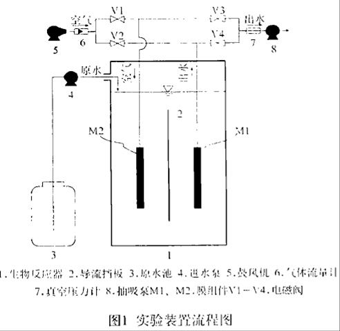 所用试验装置如图1 所示。生物反应器为一长方体容器(300mm ×120mm ×650mm) ,有效容积为16L ,中间设一挡板。膜组件采用山东招远膜天集团公司生产的聚乙烯微孔管,型号为PE - 1 和PE - 4 ,孔径分别为70~120μm 和5~10μm ,过滤面积均为0. 04m2 。膜组件分为两组,置于导流挡板两侧,其出口分别通过两个电磁阀与进气管和出水管连接,出水管上装有水银压差计,然后与抽吸泵相连,在抽吸泵的负压下经过滤获得系统出水。