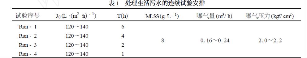 利用图1 所示的装置并采取如1. 2 所述的方法进行了分离/ 曝气微孔膜- 生物反应器处理生活污水的连续试验,以考察分离/ 曝气交替运行对膜过滤性能的影响,具体的试验条件如表1 所示,其中T 为分离/ 曝气交替运行周期(h) 。