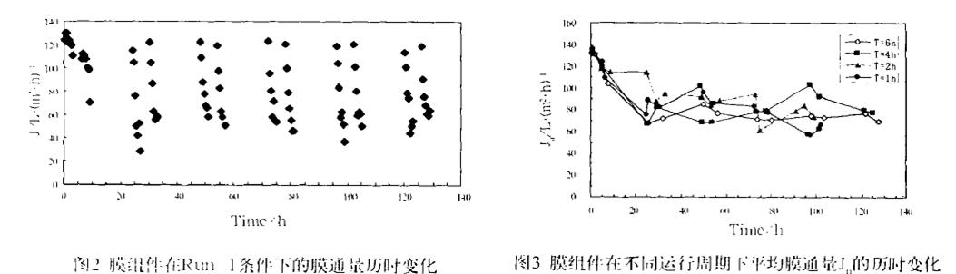 1) 对微孔管膜组件进行分离/ 曝气交替运行,膜曝气可有效地清除膜组件表面的泥饼层,大幅度恢复其膜通量,能较好地维持稳定运行。