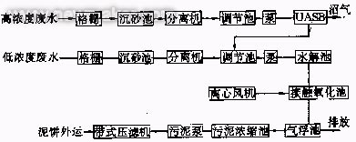 处理工艺方案2与处理工艺方案1在主体处理系统上基本上是相同的,都是水解酸化、接触氧化和气浮池,主要不同点:一是高浓度废水先采用UASB(上流式厌氧污泥床)预处理后再进入低浓度废水调节池,进行主体处理系统;二是主体处理系统调节池前增设了沉砂池和分离机(高浓度废水预处理系统中调节池前也增设了沉砂池和分离机)。