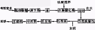 啤酒废水的主要成分和来源是:制麦、糖化、果胶、发酵(残渣)、蛋白化合物,包装车间等有机物和少量无机盐类。其水质及变幅范围一般为:pH=5.5~7.0(显微酸性),水温为20~25℃,CODCr=1200~2300mg/L, BOD5=700~1400mg/L, SS=300~600mg/L, TN=30~70mg/L。水量为每生产1t啤酒废水排放量为10~20m3,平均约15m3,目前全国啤酒废水年排放量在2.5亿m3以上。