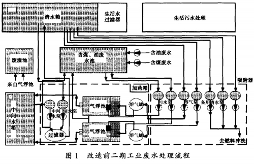 电厂废水处理系统见图l。该系统将收集的循环排废水、燃料冲洗水和燃油泵房废水经过加药、气浮、石英砂过滤器处理后,回用于生产以及绿化。此处理系统一直不能正常运行。主要存在如下问题: