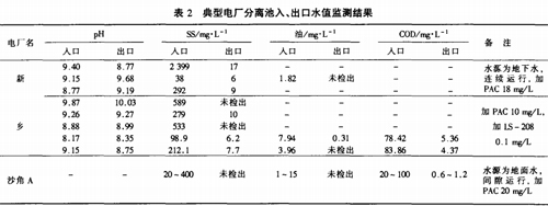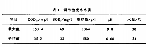 废水主要由生产废水、洗煤水、生活污水三部分组成。生产废水主要来源于化学水处理系统中的再生、反洗排水,含盐量高达4000mg/L;洗煤水主要污染物是灰粉和煤屑,悬浮物含量较高;生活污水主要来源于厂区的卫生设施、食堂等服务设施用水和家属区的日常生活污水,有机物含量较高。废水汇合后,进入调节池,起到调节水质缓冲作用。调节池废水水质见表1。