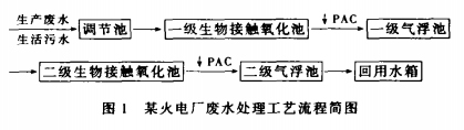 如图1所示,电厂化学生产废水、洗煤废水、生活污水并进入调节池,废水经过二级接触氧化池的生物处理和气浮池的混凝处理后,进入回用水箱。系统中采用生活污水的目的是利用其中的有机物质,充分发挥生物膜的接触氧化作用。系统中气浮池之前均需加入混凝剂(选用聚合铝PAC),加药点分别在二个气浮池的人口。