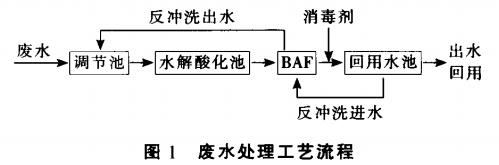 厂区各处的废水经下水道进入调节水池,调节水池对来自不同区域的废水进行水质、水量的调节。调节池前设置格栅。废水再经提升泵进入水解酸化池,来提高废水的可生化性,减轻后续曝气生物滤池的冲击负荷,进而提高曝气生物滤池的处理效果。经过曝气生物滤池处理的出水自流入回用水池:反冲洗水经溢流排水槽排至调节池。