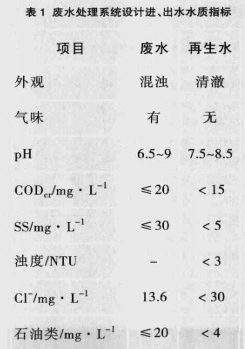 (2)防止产生生物污泥,使系统中铜管发生堵塞或产生污泥下的腐蚀,主要应控制COD、悬浮物和细菌的数量。由表1可见,废水中的cl-已达到回用要求,可不必考虑。经现场调研得知,电厂定期在工业循环水中投加杀菌剂,则再生水中细菌数量也不必考虑。因此,本工程主要处理对象是废水的pH、COD和悬浮物。经过详细论证、分析,确定工艺流程如图1所示。
