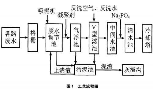 各路废水通过格栅汇集到调节池中,在调节池顶设吸泥机,废水在调节池内初步沉淀后,由废水提升泵送人气浮池。在气浮池进水管投加凝聚剂,废水中胶体和微小悬浮物通过混凝反应生成小颗粒矾花,被细微气泡携带浮上水面,由刮渣机刮除,而清水则由气浮池下部集水管汇集自流进人V型滤池。V型滤池滤后水进人中间水池,通过中间水泵送人清水池,在中间水泵出口投加Na3PO4调整清水pH值。最终产品水由清水泵送至工业循环冷却水池。来源:谷腾水网
